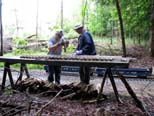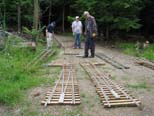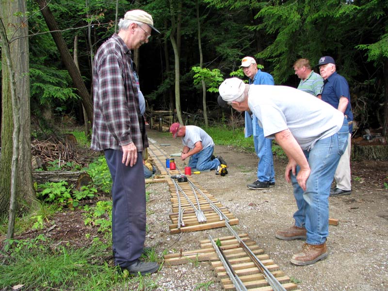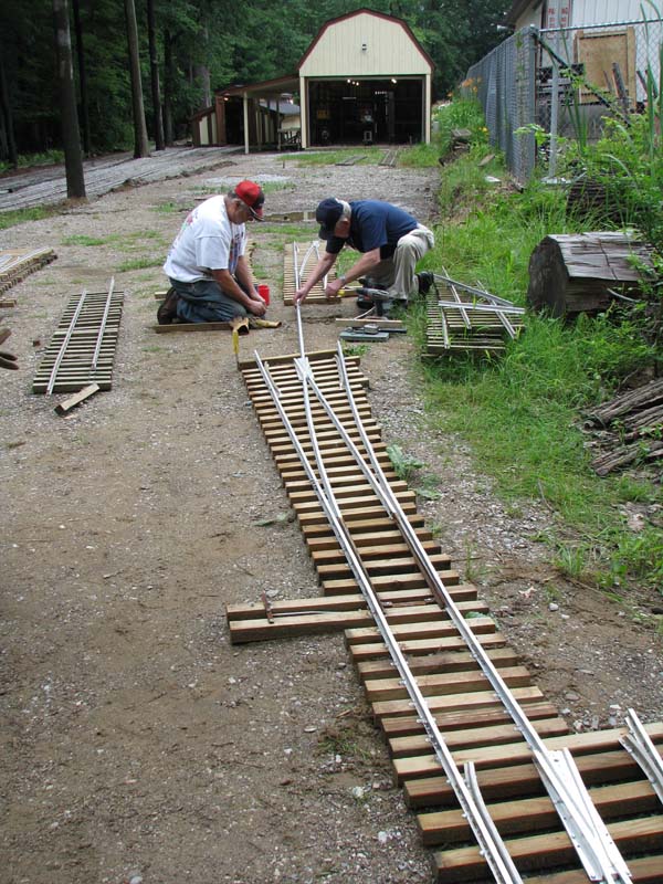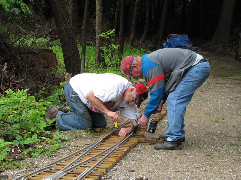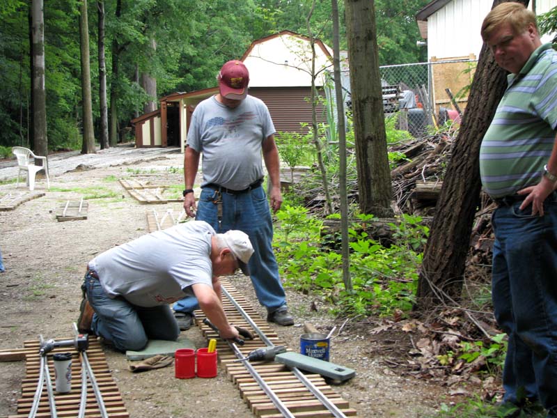 Steve Zaken, John Koontz, Wally Pausch and Rick Nagy were tamping the ballast when I arrived on this rainy morning. Ken Brooks and Bill Deptowicz making up a track panel on the work table. |