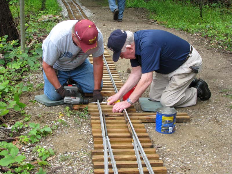 Dick and Ken exchange ideas about the trackwork as Rick bolts the rail connections to the switch. Wally and Rick work on changing the switch throw to the other side. |
