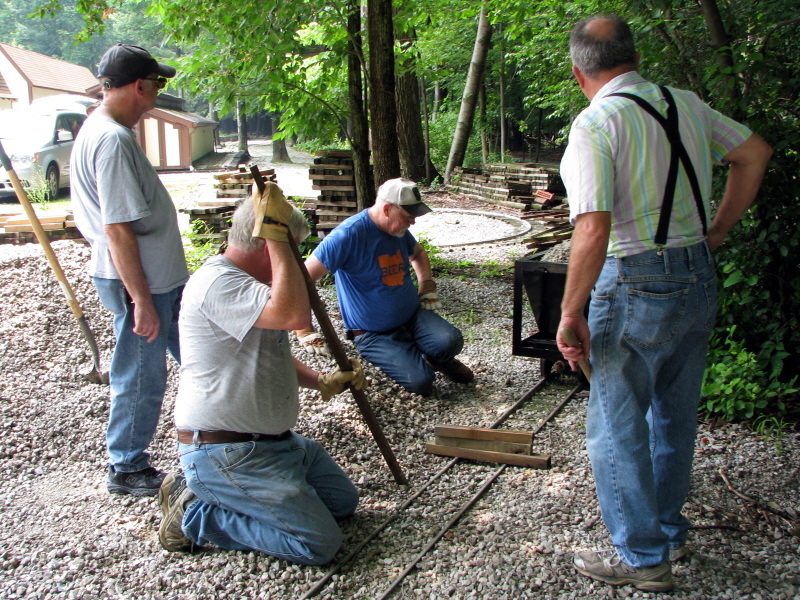 Frank Smoley, Wayne Boron watch as Bob Beardslee drives home some track screws's to stabilize the rail on one of the steaming bays. The turntable in the center of the steaming bays had a mismatch with rail height when it was swung around to some of the steaming bays. |