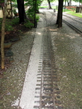 Rick continued from the diamond for the Orchard yard to the Orchard yard lead crossing to lay down ballast as he pulled out towards the mainline spreading the limestone as he moved. Bill Deptowicz uses the ballast sweeper to level the newly laid limestone flush with the top of the ties. |