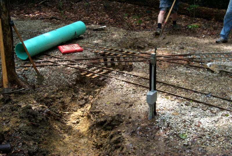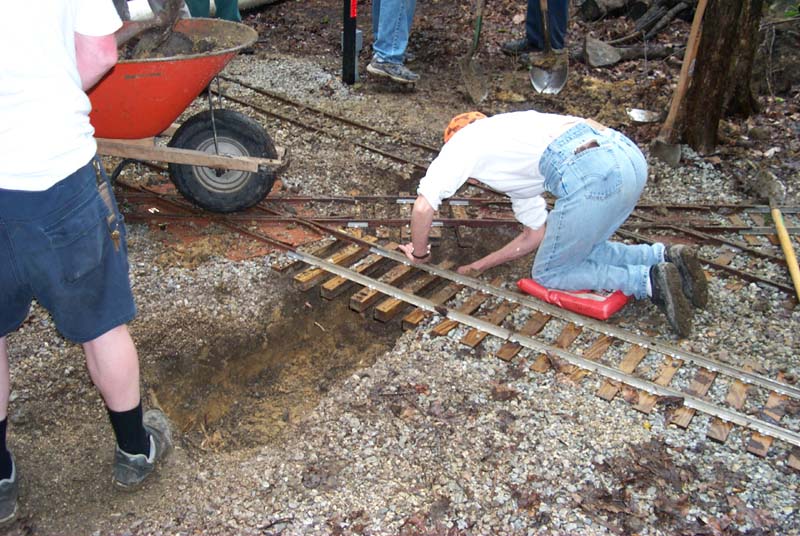 We got a good start at undermining the track for the new 8" pipe. Edith trying to pull out a stone which this area just seems to have an abundance of along with roots. |
