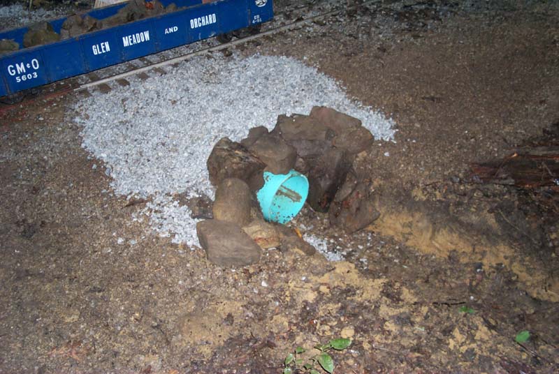 George and Joe continue with the trenching down the hill to ease the water flow as Rick behind them rakes out the ballast at the tracks. The finished outfall of the pipe with ballast added and it's starting to rain. |