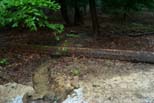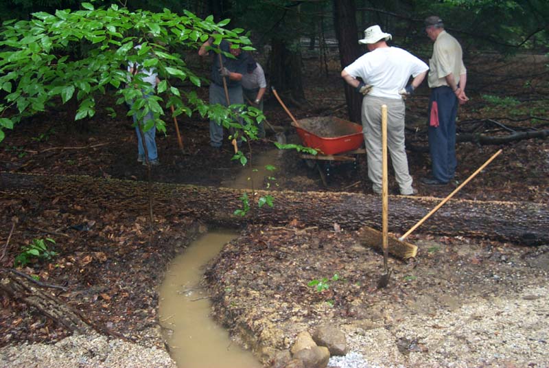 The guys continue the trench under a tree that has long fallen and nature is starting to reclaim it. Bill Deptowicz finished putting the stones at the headwall to guide the water towards the pipe and the rain continues. |