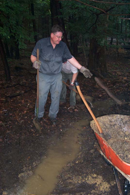 Frank and George managed to get the wheelbarrow down to the fill area without dumping the load. Edith Hacker, George Davidson and Rick Nagy digging for our new culvert at the crossings. |
