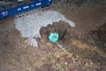 After taking a break at the station because of the heavy rain we return and find that the culvert is working. Now the trench digging is really sloppy with all that water to contend with. |