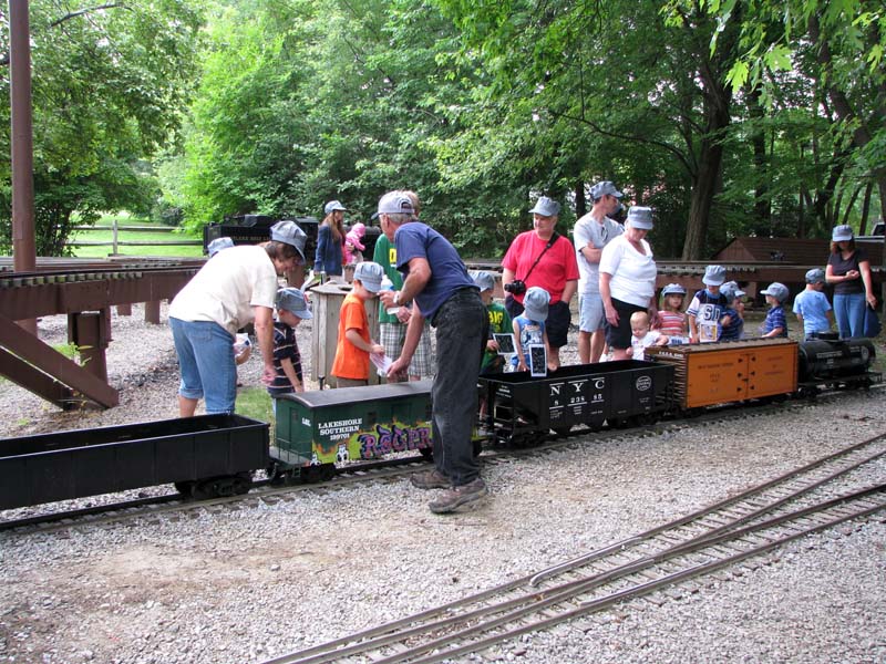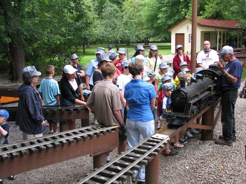 Here he is showing the group the inside of his boxcar that contains the compressor for the air brakes on his train. The Park had made up cards that were given to each child with a different type car on it and the kids had to guess which car matched the one on the card. |
