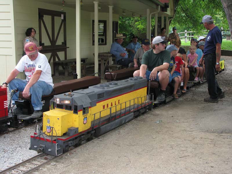 Mike Harkleroad leaving the station with a load of attendees in their engineer's hat. Rick Nagy with the club's GP38 leaving the station as Mike waits for his train to be loaded. |