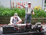 Dave Cryor was cutting the grass even though it was wet. Behind the Stanek Car Barn, Frank Smoley and Wayne Boron had the cover off of the GP38 as the horn wasn't working and our Track Master said it was too wet to do anything with the track today. |