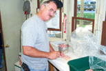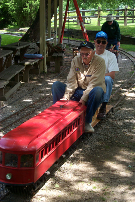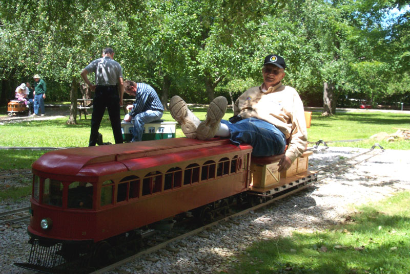 Dave Foster cutting up and trimming the chicken breasts for the cookout this evening. Frank getting ready to take his interurban out on the mainline |