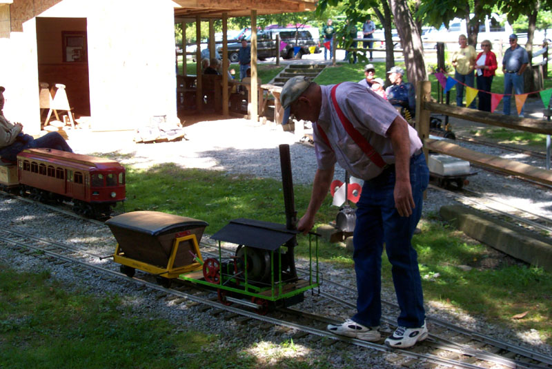 George Metts on his Maytag gas powered hit-and-miss engine, one of two that he and Skip Frank built. The Galloping Goose on the tracks in front of the station |