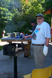 Harold Sicherman and Margaret Uhrich chat while waiting. Mike Uhrich manning one of the grills and cooking the chicken. |