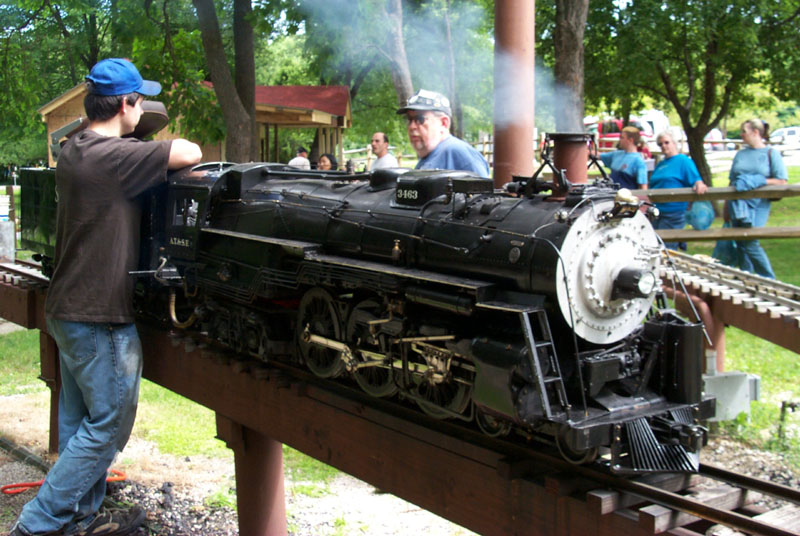 Judson Elliott just pulled into the station to let the passengers off. Karl Losely is checking the grates in the firebox between runs. |