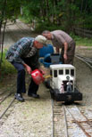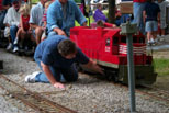 Robbi trying to remove something that is wrapped around the axle. All's well as the train heads out with Dave Foster as engineer and Linda Harris as conductor |