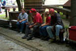 Karl waiting for the passengers to load with Roy Harris and Jerry Bell in read shirts doing the honors. Pulling out after the signal "All Aboard" is given |