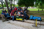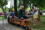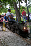 A portion of the line of people waiting to ride the trains. R.C. Yedlicka seated in blue counting riders, Rex leaving station with Robbi Haines between trains and Dave Foster on engine |