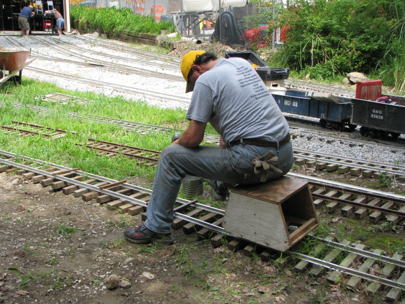 The extension of the yard ladders into our newly created yard area. John removing the screws as we are re-using some of our old ties for the yard which will see light use. |