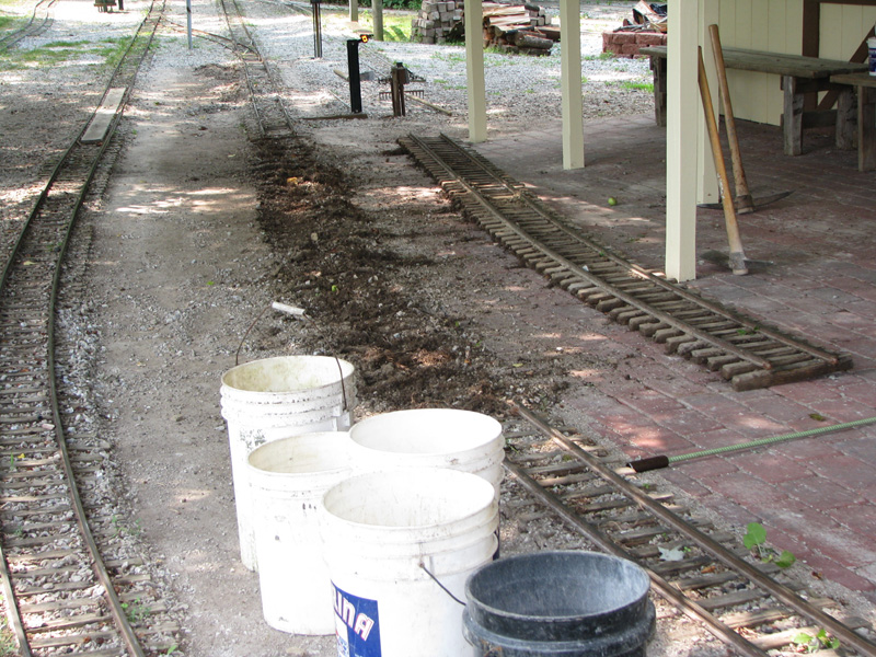 Some of the members thought that we should lower the track in front of the station so the top of rail would be at the same height as the newly installed pavers. This meant the first track would have to be lowered 2 1/2 inches so we started removing the ballast between the tracks. |
