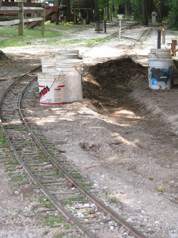 One 20 foot section removed and we found the ties after 27 years to be in bad shape. Lew Fowler filling the buckets to be hauled by train to a dumpng site on the Branch Line where we are going to work on next year. |