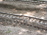 When everyone stopped for the next break session I took a picture of the progress so far, 100 feet of track had been removed. Dick was replacing the ties by just putting a new one between the old ones and this kept the gage but he still checked with the track gauges. |