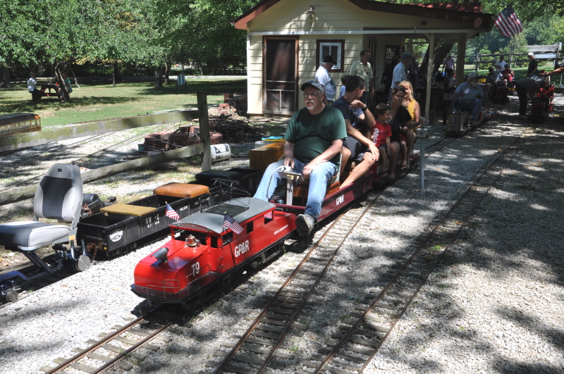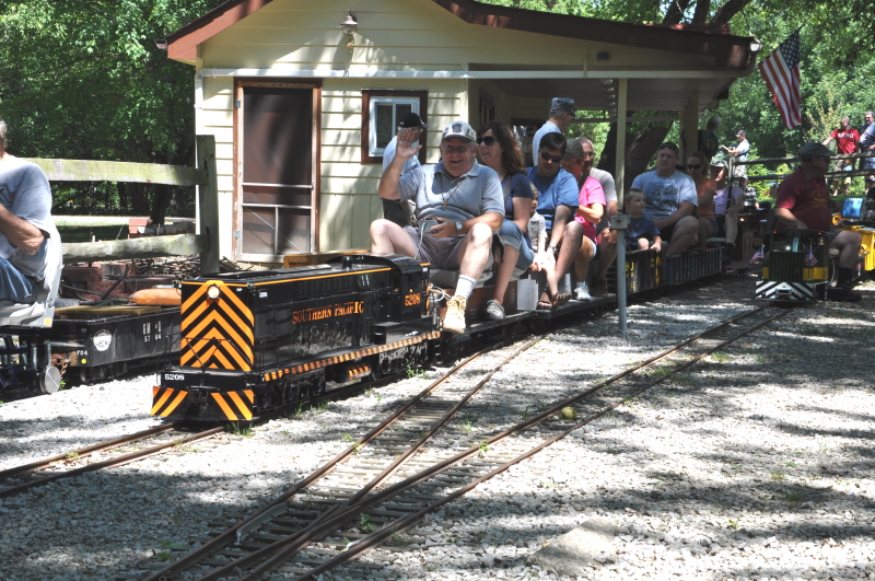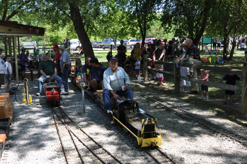 Ken Brooks behind his engine as he talks with Roy Harris and Judson Elliott as Paul Emch departs the station with his passengers. Ken finally got his train loaded and departs the station with a full complement of passengers. |