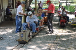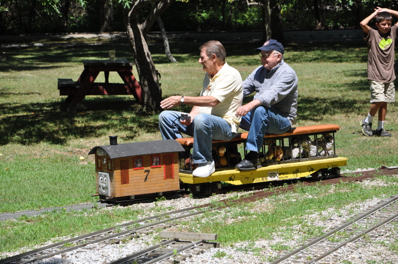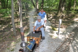 Bill Besselmen is our passenger counter and is looking over the loading of Judson's train as Roy finishes giving the riders their instruction. A guest of the club is getting a chance to drive Toby with George Metts giving him instruction as they run on the loop behind the station. |
