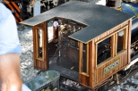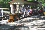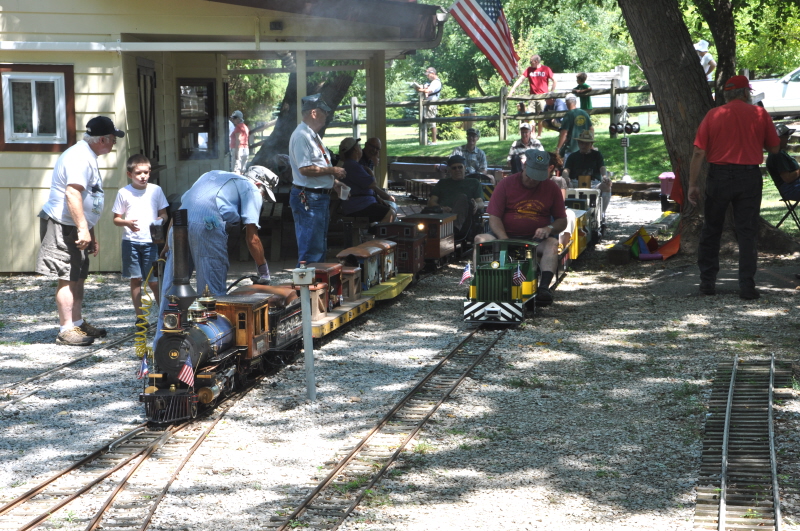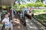 Five trains are stacked up as they come into the station to unload their passengers. Bill, our counter, checks over the loading of the train as Rick waits for Roy Harris to finish loading and give the all clear to move his train. |