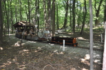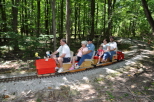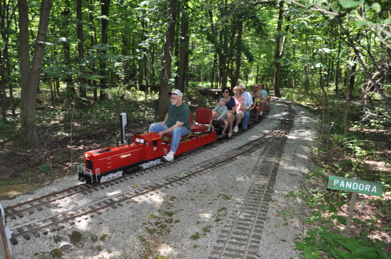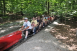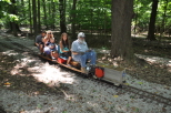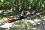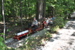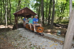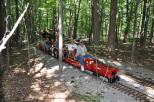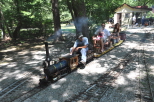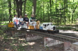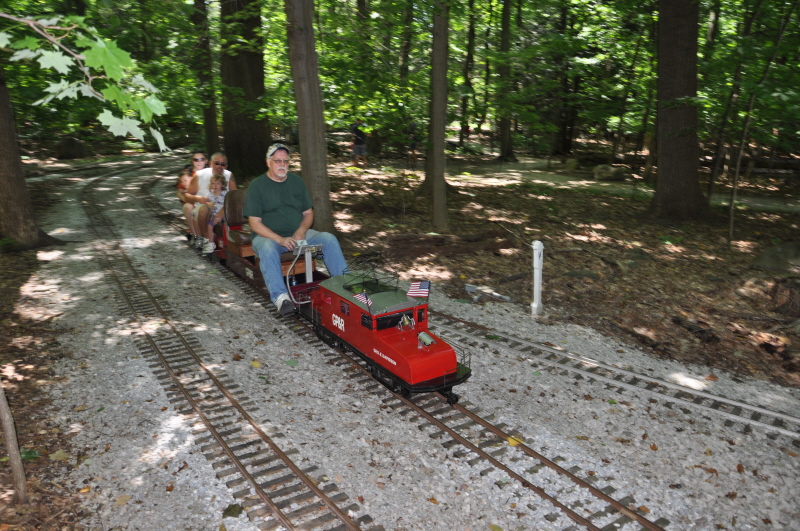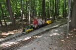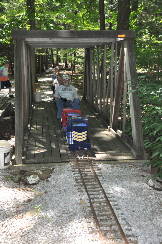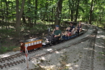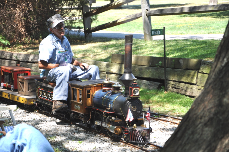 Skip coming around the curve at Shoe with his steam engine with the safety lifted and will soon be passing through the Covered Bridge. Following not too far behind Skip, I caught Rex Shriver as he approached Shoe with his trainload of passengers. |