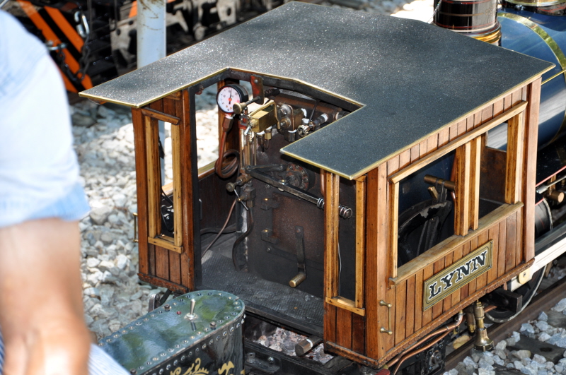 Lois and Frank Smoley, sitting on the bench, watch the activities as the trains come into the station to unload their passengers. A view over Skip's shoulder of the backhead on "Lynn" showing some of the valves, controls and the water gauge that he has to monitor. |
