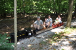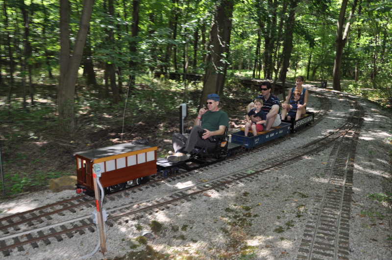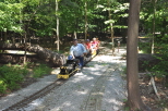 Ken with his electric powered Steeple cab climbing the grade at Mackey's Run on his way to Big Bend Bridge. A few minutes later Judson came by the same spot with his scratch-built engine and his passengers look like they are enjoying the ride. |