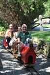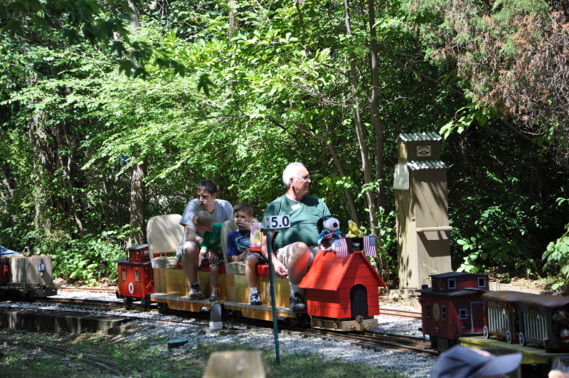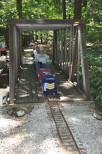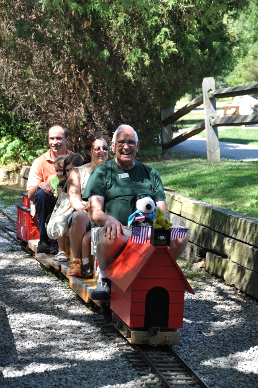 A view of Rex on the Big Bend Bridge with his train from the inside of the curve. Bill Deptowicz with the Snoopy train coming into the station at the end of the run will soon unload his passengers. |