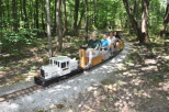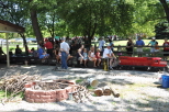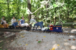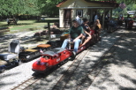 With Scott Hewis having had his train loaded with passengers, he departs the station waving to the photographer. Skip Frank puts water in the tender of his steam engine as Ken Vendlinger rolls to a stop ready to load his passengers. |
