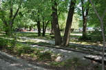 Marty Pinkston with his scratch built electric powered engine crossing over the Park Access road as he heads down the mainline. Dick Clark at the controls of his SW1500 as he passes by Drudgery near the beginning of his run. |