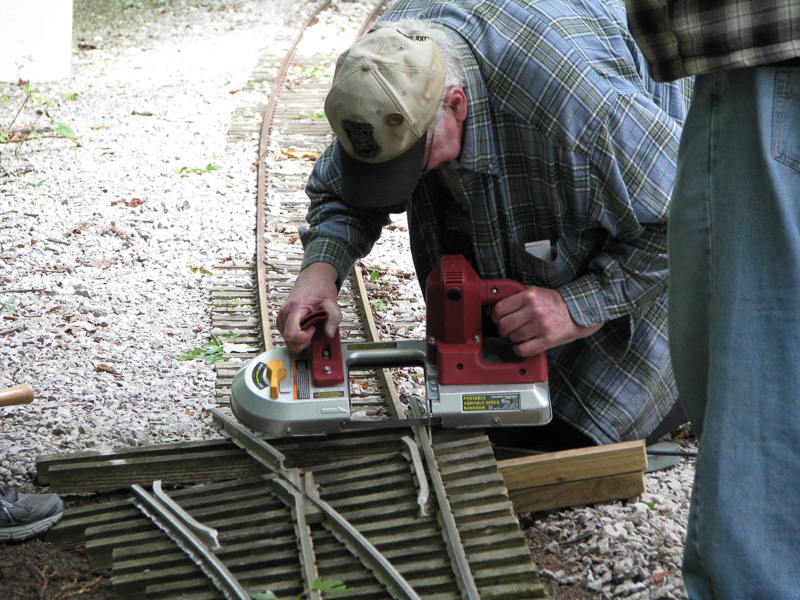 After Dick decided where he wanted to have the switch he took to the task of cutting the existing steel rail with an electric portable bandsaw powered by an extension cord from the transfer table. Mark it once, cut it once and it was still too long. |