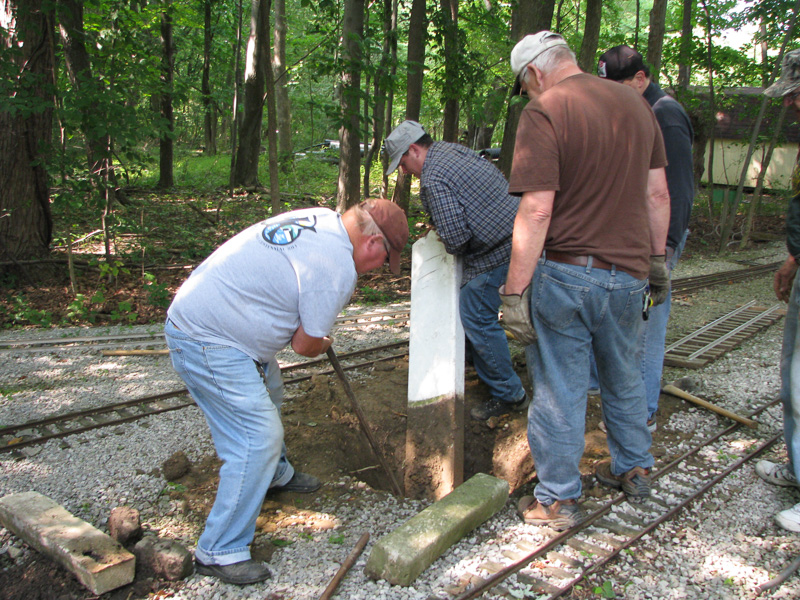 The guys slid two pry bars, one at each end, under the whistle post in preparation of the lift. With the pry bars in place under it, four guys lifted it and carried it off to the side. |