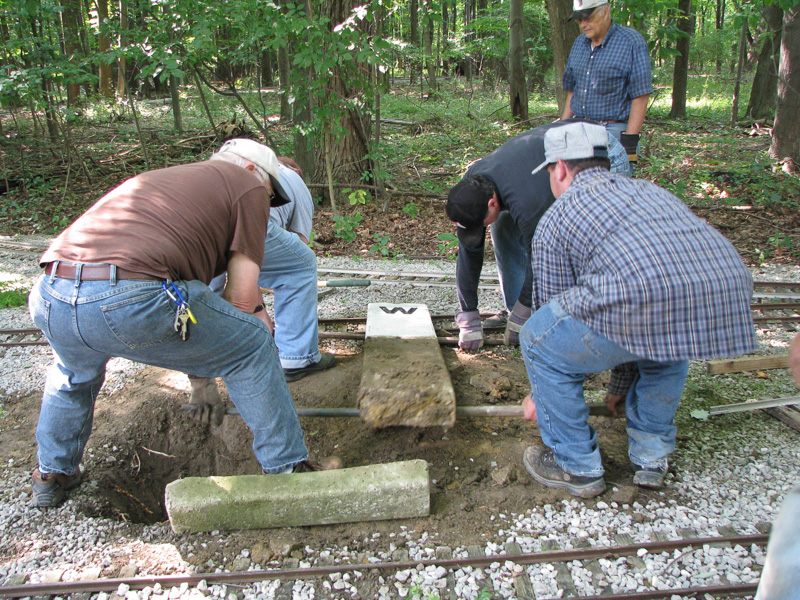 Dick and Ken work on fitting in the ties between the end of the switch and the reused track panel and screwing the rail down to them. Well we've dug more than 18 to 20 inches and I think our concrete whistle post must weigh pretty close to two hundred pounds. |