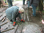 Matthew and Frank start digging to remove the whistle post which Dick says he thought was 18 to 20 inches into the ground. As this was going on Dick was fitting and connecting the rail from the switch to the track panels for the siding. |