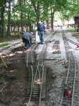 Matthew Bolyard and Tom Reder dig to uncover the culverts ends in a short trench we had there with culverts under the tracks. A view showing the ballast removed and the track panels that had been placed up to the whistle post where Matthew and Tom had been digging. |