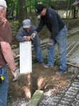 Rick trying to use a prybar to leverage the post up out of the hole as Matthew pulls and tries to hold it up to no avail. We used the piece of sandstone, standing it on end, in front of the post as a fulcrum for the prybar that had a chain wrapped around the post and managed to get it up out of the hole. |