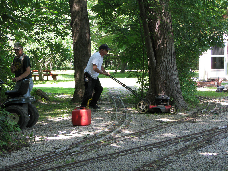 Frank Smoley is getting the riding tractor out to cut grass as Dave Cryor heads off with the push lawnmower to cut around the steaming bay area and station. After the break the crew started in laying another track panel and here Rick Nagy taps the end of the rail to tighten up the joint. |