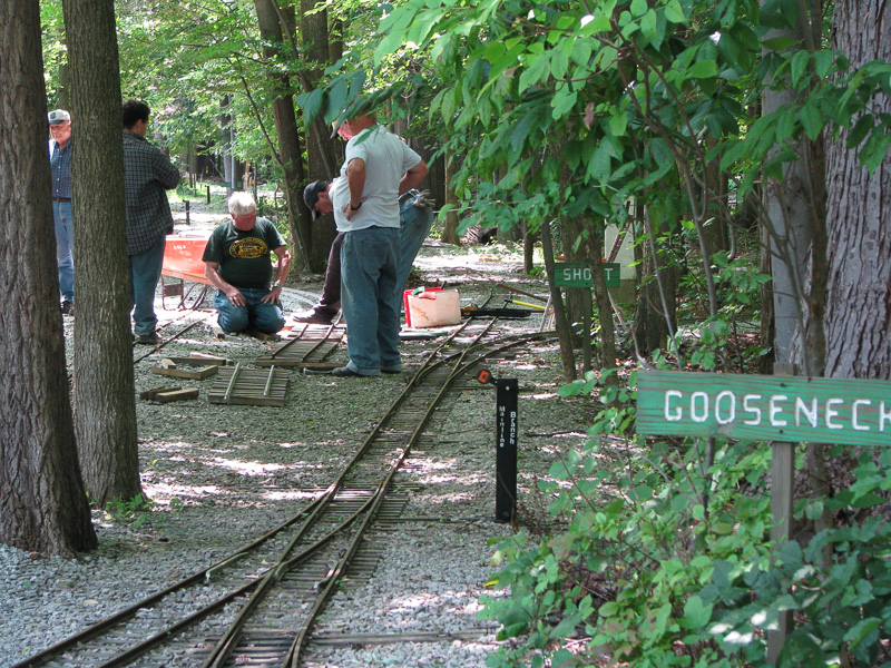 John Koontz and Frank check out the gap in the rail as our track master Dick Clark overseas at all. Dave Hird, who is on the switch committee, does his inspections with lubricating and adjusting that may be required of each switch. |
