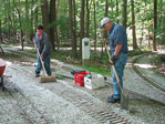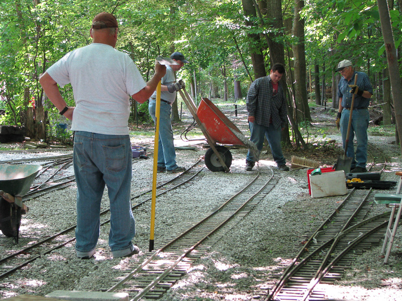 Rick Nagy and Tom Reder wait for Frank to dump another load of ballast on the track. Frank tilts the wheelbarrow, as Matthew watches, to fill in the areas in the track that were a little light on ballast. |