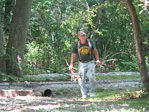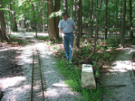 Gee, the whistle post is right where we left it and Frank indicates where we are going to dig a hole for its relocation. After the hole got dug, but not quite as deep as it was before, it was time to move the post to its new location. |