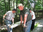Frank holds the post upright in its tentative position as Matthew and Ken put stones around the base in the bottom of the whole. The whistle post is situated in its new position backfilled and tamped to do its job for a good many more years. |