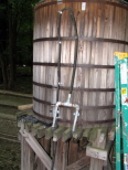 The internal plumbing for the float assembly hanging on the outside of the water tower will soon have the float attached and set back into the tank. Judson making the connection as Bob watches him. |