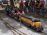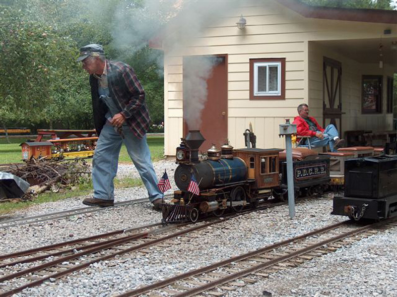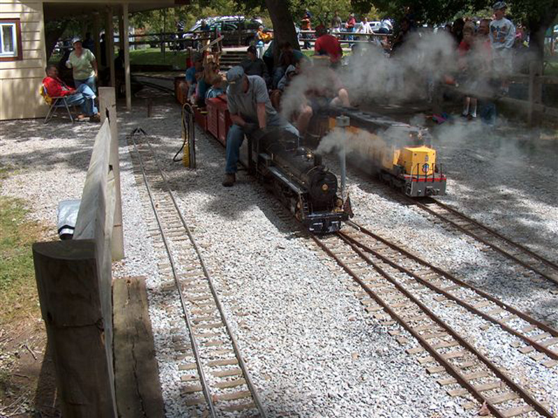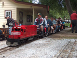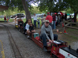 The happy expressions for the train ride they are about to undertake is what the trains are all about. Paul Emch with his gas powered Morris SW1200 NKP engine is about to depart the station. |