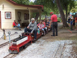 Robbi as engineer moves the train up to load as conductor Jerry Bell watches the train loading. Rick at Shoe with his load of passengers and soon will be at the halfway point of the ride. |