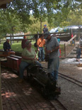 Dave Foster is the passenger counter today as he decided not to run his speeders because of the rain forcast. Roger changing engineering position with Robbi Haines before the train moves up to the loading area. |