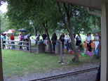 They said it would rain and it has but some of the riders are undaunted and prepared. With a hearty spirit the passengers wait for their turn to ride the trains in the light rain. |