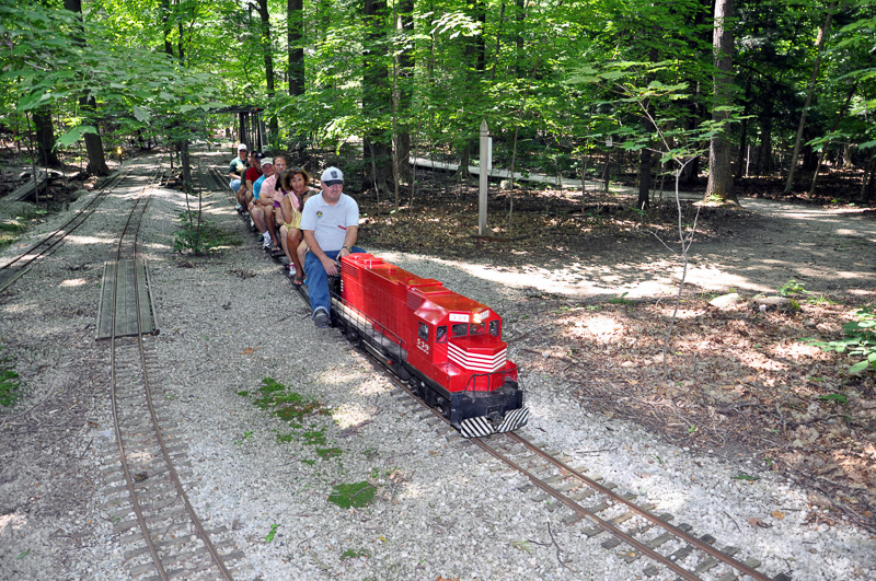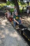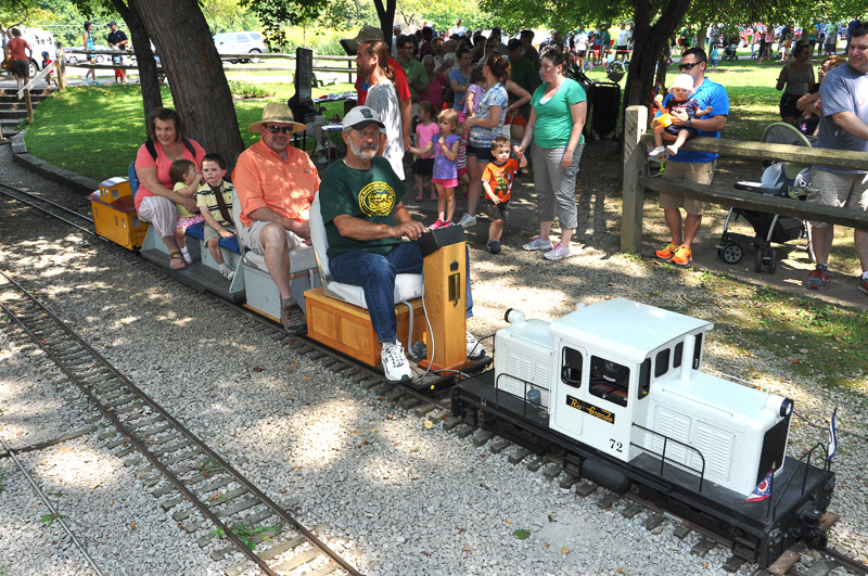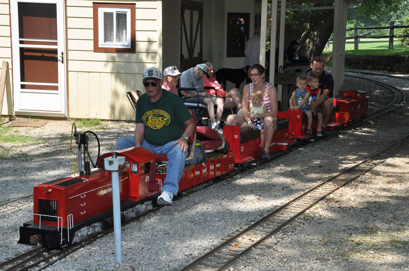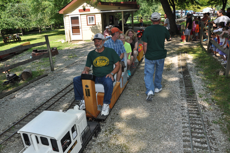 Dick Clark increases the throttle on his gas engine, a SW1500 diesel replica as he starts his first run. John Koontz running the Park's engine leaves the station with Frank Smoley as his conductor on the rear. |