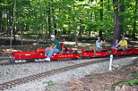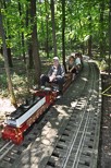 Ron Malinowski with his train on the curve that leads into Shriver Station with his three passengers. Paul Zorko has just come off the Big Bend Bridge and passed through Pandora on his way towards Shoe and the Covered Bridge. |